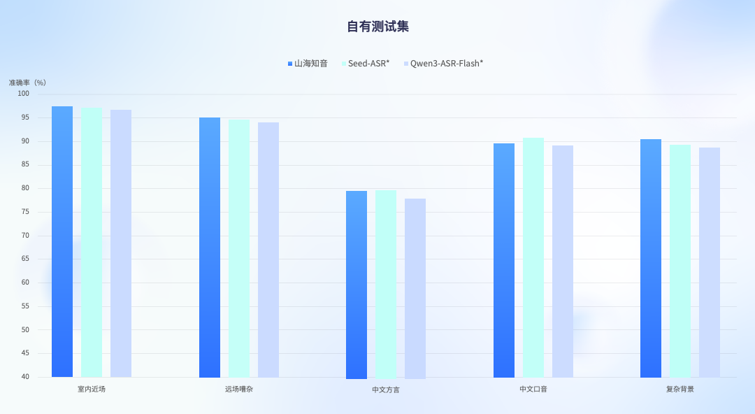 此次模型ASR能力在公开测试集和自有全场景测试集中,均显现了领先的语音识别能力,在评测中实现了从通用到极端全面的领先水平,超过了国内主流的开源和闭源语音大模型,达到业界最高水平。特别是在高难度的复杂噪音与方言口音场景下,相比主流ASR模型性能提升了2.5%至3.6%,在复杂背景音环境下识别准确率更是在业内首次突破90%。